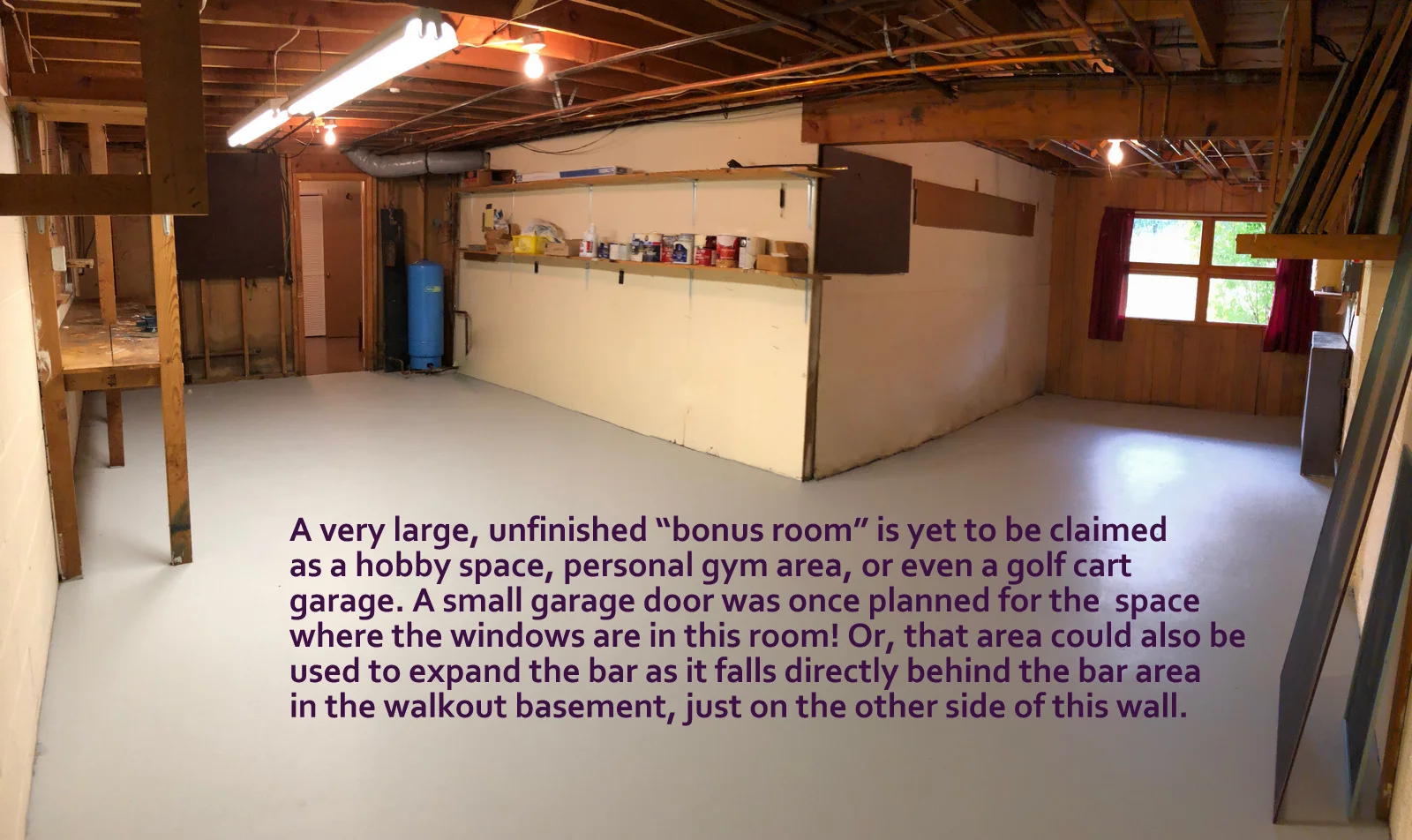 If you envisioned something different, a very large "bonus room", an unfinished space, exists behind the bar, so there's great remodeling potential to personalize the space.